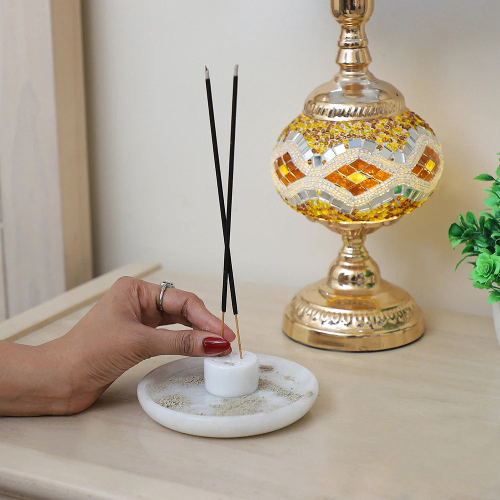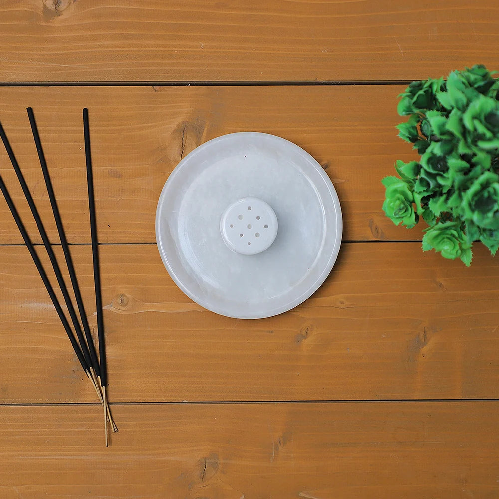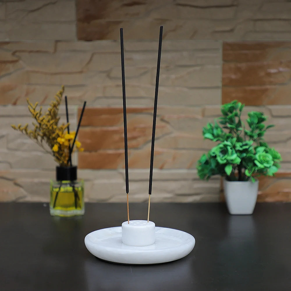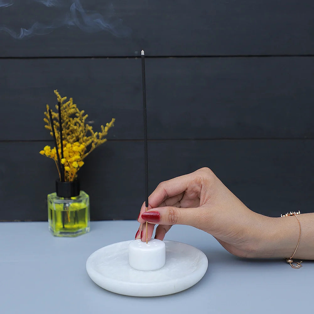 Marble Incense Holder, is a perfect addition to elevate your space. Crafted with precision, this round incense burner features 9 holes for sticks, ensuring a harmonious distribution of fragrances. The accompanying ash catcher tray keeps your surroundings pristine. This natural marble aromatherapy ornament is not only functional but also a handmade room decor masterpiece. Enhance your meditation experience with this thoughtfully designed accessory that combines functionality with aesthetics. Elevate your ambiance and make a statement with our Marble Incense Holder – the epitome of sophistication and tranquility. This Incense holder is in different styles as well Bowl style, Plate Style and Tray Style.