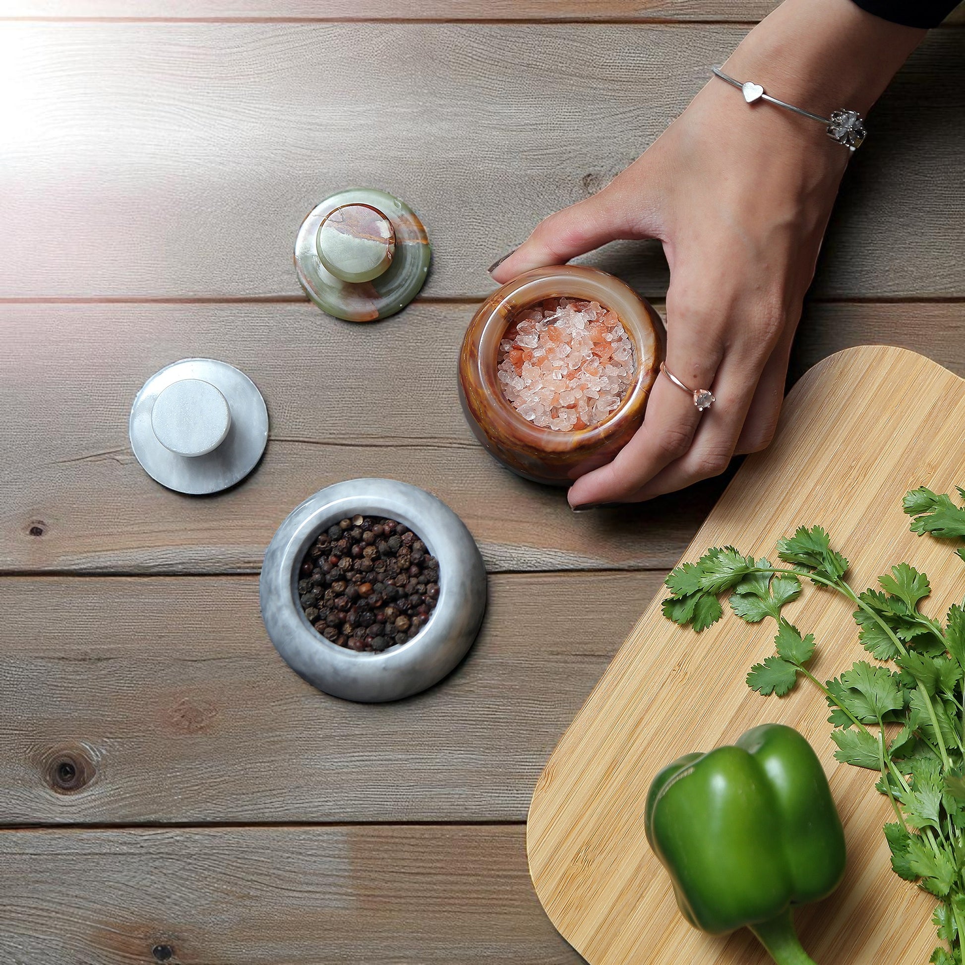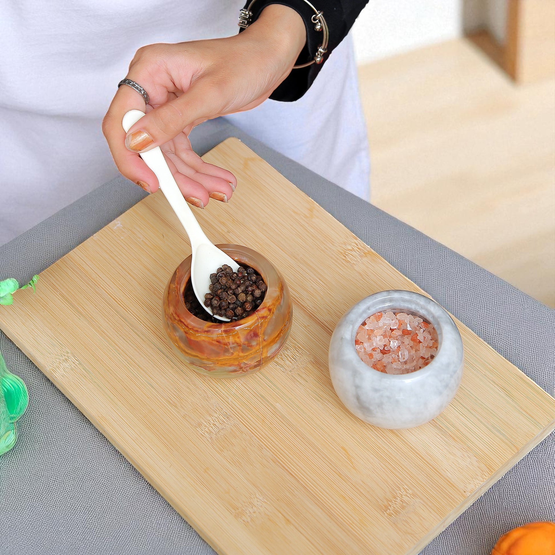 Perfect Size & Design: Measuring 3" x 2.5" and weighing 16.22 oz each, these elegant marble salt containers enhance your countertop while keeping salt, pepper, or spices fresh and within reach.