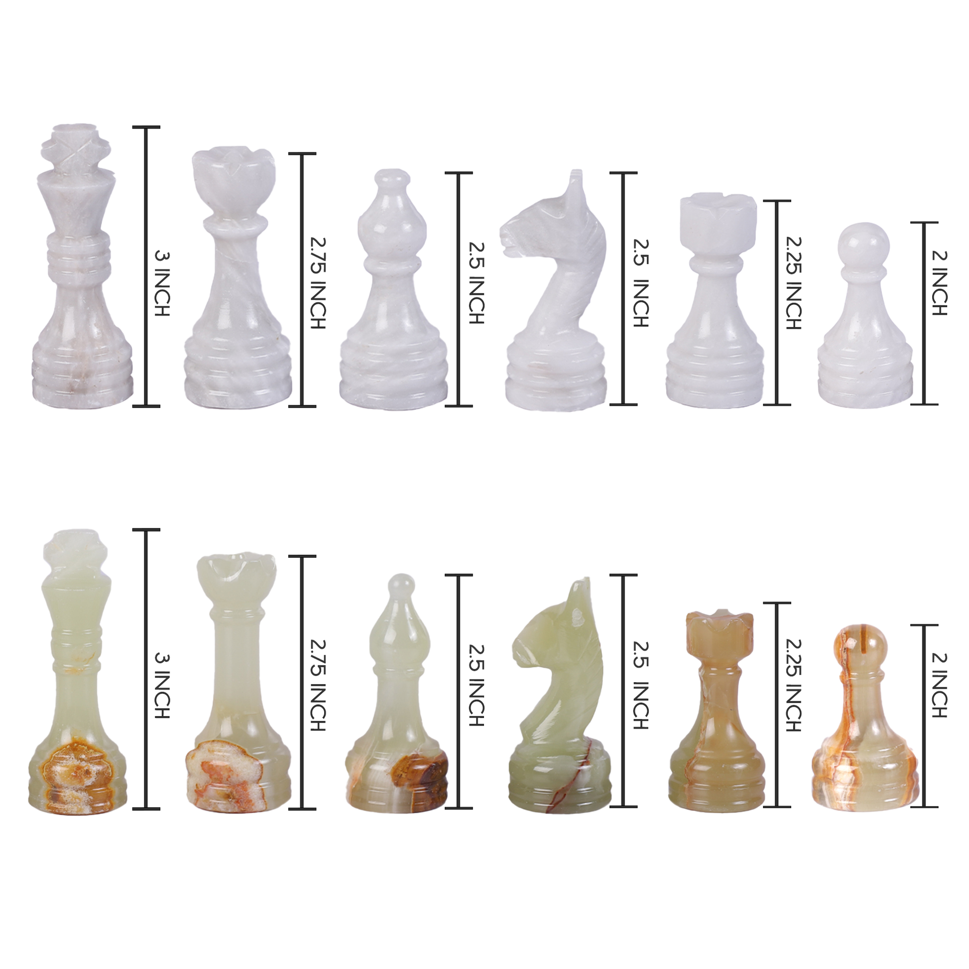 Perfect Dimensions: King 3", Queen 2.75", Bishop 2.5", Knight 2.5", Rook 2.25", Pawn 2".